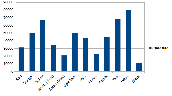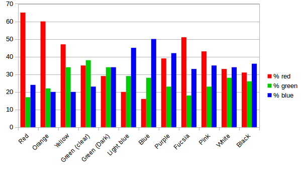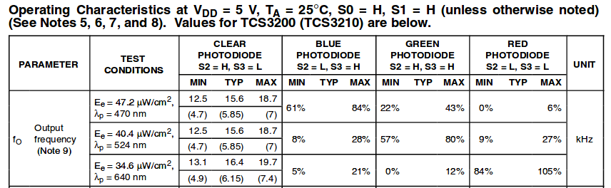 It turned out that reading the datasheet and trying to decide the color from it just wasn’t enough. I needed to take some samples and watch the output for myself, so I wrote a very simple code (using my newly created library) that gave me the measured frequency for each filter as an output (the average of ten samples) and then tested it with different colors. These were the results: