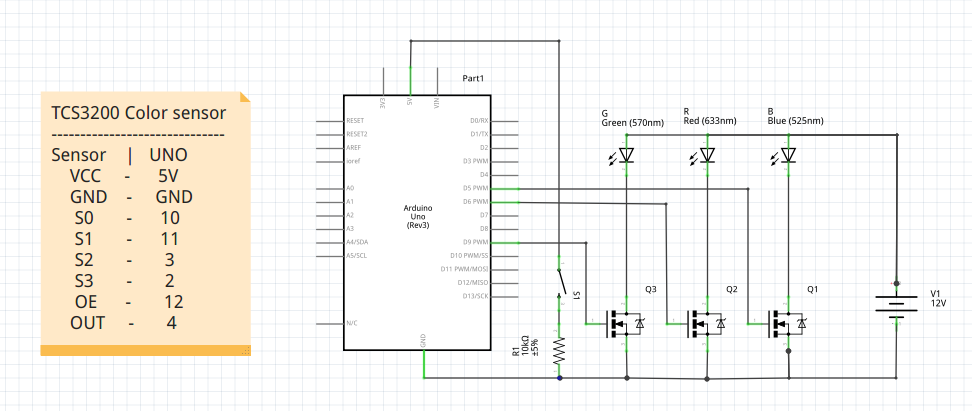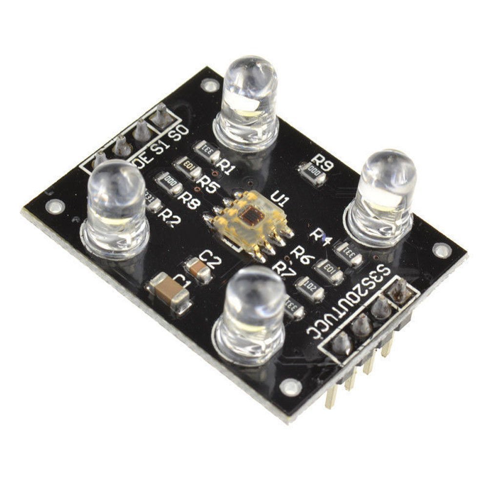 The TCS3200 is a color sensor that comes with 4 white LEDs. It has an array of photodetectors with different filters (red, green, blue, clear). Inside the chip there’s an oscillator which produces a square-wave output whose frequency is proportional to the intensity of the chosen color.